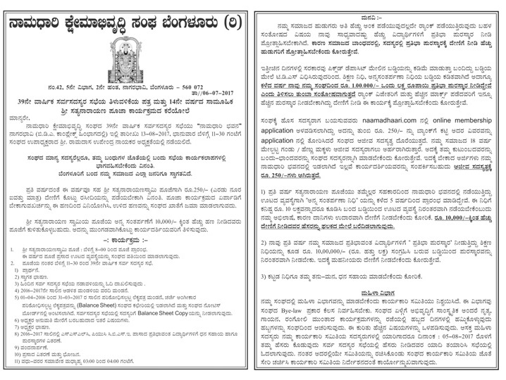 ಬೆಂಗಳೂರು : ನಾಮಧಾರಿ ಕ್ಷೇಮಾಭಿವೃದ್ಧಿ ಸಂಘ ಬೆಂಗಳೂರು(ರಿ) ನ 39 ನೇ ವಾರ್ಷಿಕ ಸರ್ವ ಸದಸ್ಯರ ಸಭೆಯು ನಾಮಧಾರಿ ಭವನ ನಾಗರಭಾವಿ ...