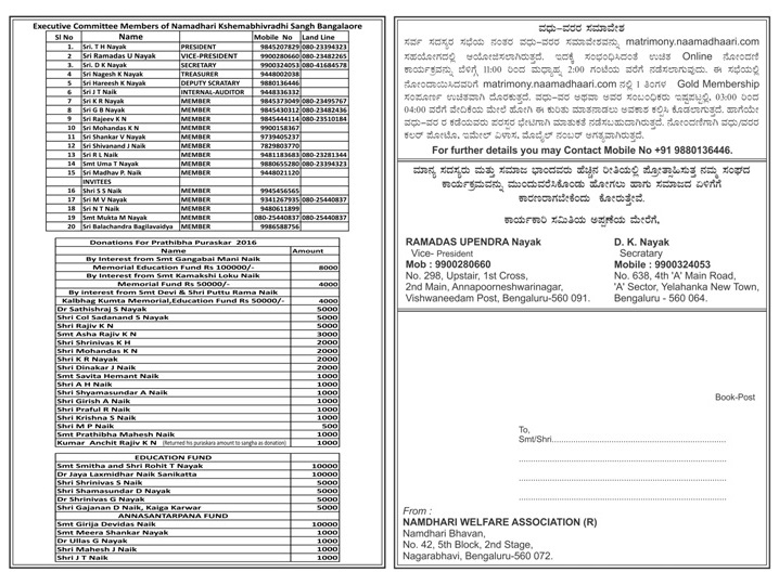 ಬೆಂಗಳೂರು : ನಿನ್ನೆ ಭಾನುವಾರ ಬೆಂಗಳೂರಿನ ನಾಮಧಾರಿ ಕ್ಷೇಮಾಭಿವೃದ್ಧಿ ಸಂಘ(ರಿ) ದಲ್ಲಿ ವಾರ್ಷಿಕ ಸರ್ವ ಸದಸ್ಯರ ಸಭೆಯಲ್ಲಿ 2019 ನೇ ಸಾಲಿನ ...