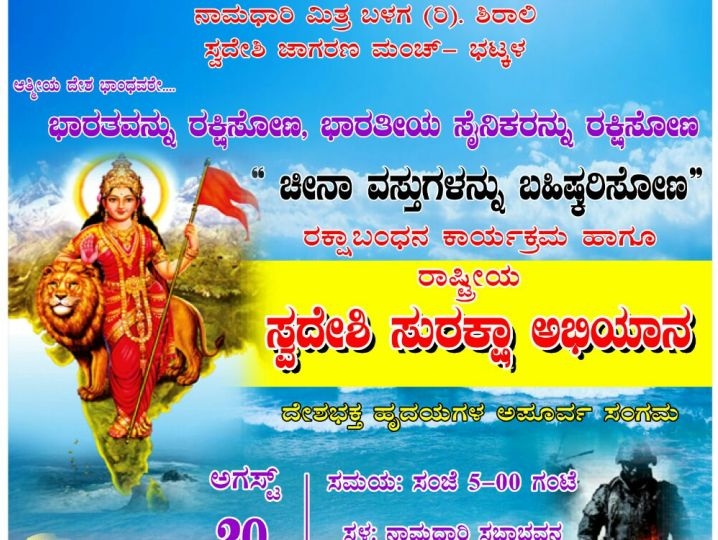 ಭಟ್ಕಳ : ಚೀನಾ ವಸ್ತುಗಳ ಬಹಿಷ್ಕರಿಸಿ ನಾಮಧಾರಿ ಮಿತ್ರ ಬಳಗ (ರಿ) ಶಿರಾಲಿ,ಭಟ್ಕಳ ದಿನಾಂಕ 20-08-2017 ರಂದು ಸಂಜೆ 05-00ಕ್ಕೆ ...